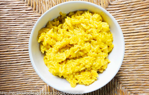 Receta y fotografia original de: Karla para Recetas Fáciles con Arroz.Ingredientes:2 tazas de arroz crudo1 cebolla grande (o dos pequeñas)1 diente de ajo1/2 cucharada sopera de cúrcuma (o condimento para arroz o Sabor 15)Sal a gustoPimienta a gusto1/2 cucharada de harinaPreparación:Picamos la cebolla y el ajo.Calentamos agua.Cocción:Tomamos una cacerola y le tiramos un chorro de aceite. La llevamo ...