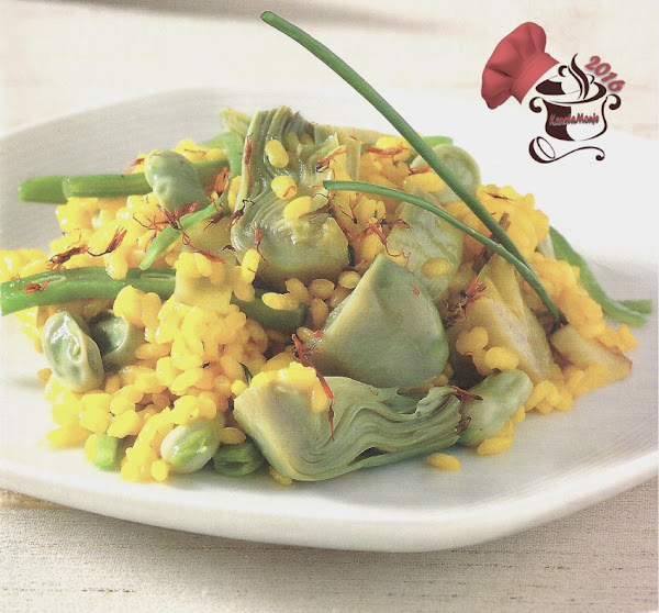 Incorpora el Arroz, dóralo unos instante, y añade las judías verdes, las habitas y las alcachofas. Cubre con 8 vasitos e agua hirviendo, salpimienta y deja cocer a fuego suave durante 18 minutos, moviendo la paella de vez en cuando. Sirve caliente decorado con azafrán y unas ramitas de cebollino lavado y seco.
