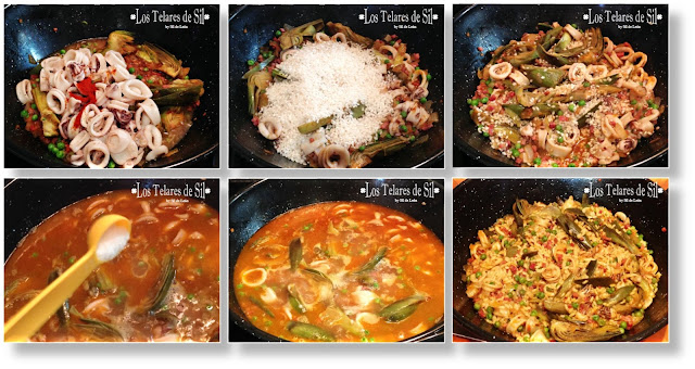Cuando tomen este aspecto (imagen) agrega los calamares, los guisantes, el caldo hirviendo, el pimentón, la sal, las hebras de azafrán, el arroz y deja a fuego lento unos 20 MINUTOS.