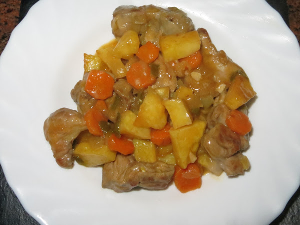 un pimiento rojo,una zanahoria,una manzana,1/2 cebolla,un vaso de vino blanco (o tinto),dos cucharadas de salsa soja,