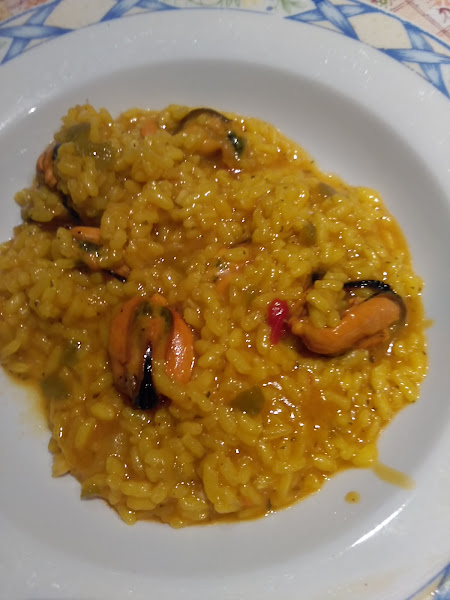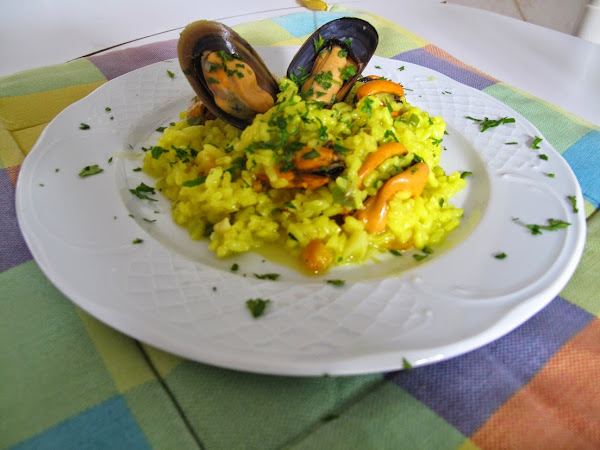 Agregamos el arroz y vertimos el caldo reservado. Completamos con un poco de agua y cuando esté el arroz hecho, incorporamos los mejillones sin la concha excepto seis que utilizaremos para adornar. Un poco de perejil y a gozar.