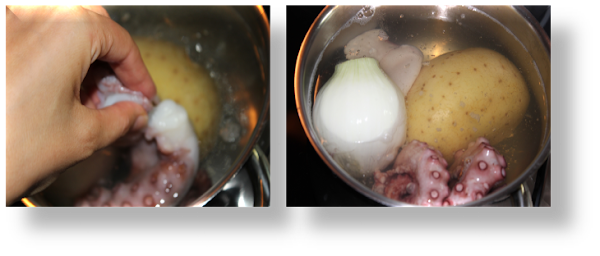 Pon a hervir en una cazuela con agua mineral (sin sal), 1 cebolla y 1 patata. Cuando rompa a hervir, "espanta el pulpo" 3 veces y sumerge en el agua de cocción.
