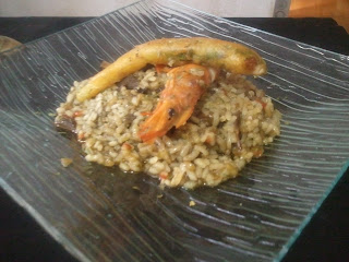Emplatamos el arroz y disponemos por encima las rodajas de chipirón y las gambas previamente salteadas.