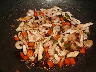 parte, lavar bajo el grifo el arroz, para quitar el almidón, cocerlo en una olla con abundante agua y un poco de sal, cuando este cocido, escurrir y enfriar bajo el grifo, dejar escurrir bien. Precalentar el horno a 150º y extender sobre la bandeja de horno, forrada con papel vegetal, el arroz, bien extendido, y secar en el horno durante + ó- ½ hora, cuando seque por la parte superior, darle la vuelta para que se seque la parte inferior.En el wok poner aceite de cacahuete, añadir la cebolla, el pimiento y pocharlos. Cuando este medio pochado añadir la zanahoria, rehogar, añadir el pollo, freír un poco hasta que las tiras de pollo se separen las unas de las otras y estén casi hechas, entonces añadir la harina, rehogarla para que se cocine y tras esto añadir el calabacín, rehogarlo junto con todos los ingredientes y añadir los champiñones, dejarlos que suelten el agua. Cuando ya este el agua de los champis ya casi consumida, añadir la cucharada de salsa de ostras, mezclar, verter la salsa de soja y el vaso de agua, sazonar con precaución, ya que la salsa de ostras y de soja son saladas, y añadir las gambas peladas y un pellizco de azúcar, dejar cocer todo junto, hasta que la salsa espese. Por otro lado ir friendo el arroz aparte en aceite de girasol bien caliente, hasta que suba y se infle, al sacarlo colocaremos sobre los platos donde se vaya a servir y verter por encima la salsa Ku-bak.