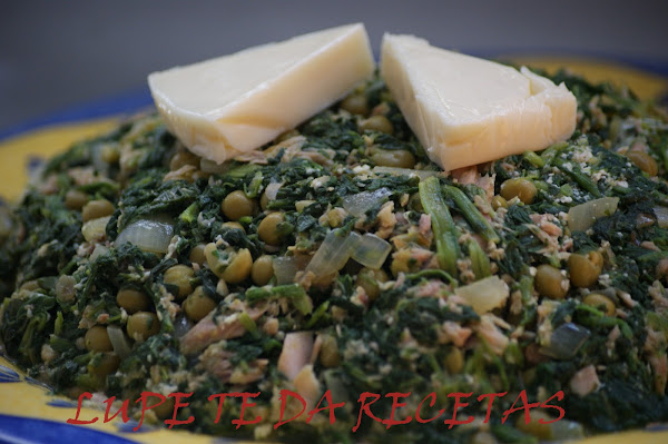 INGREDIENTES: 1 lata de atún Escurís Batalla de 250 gr. 1 latita pequeña de guisantes 400 gr. de espinacas 2 ajos sal, tomillo y orégano 2 yogures naturales o un chorro de nata como se prefiera 1 cebolla mediana o grande unos quesitos ELABORACIÓN: Cocer las espinacas, escurrir y reservar para que pierda el líquido.Picar la cebolla y los ajos finitos, salar poco porque el atún ya sala, pochar y cu ...