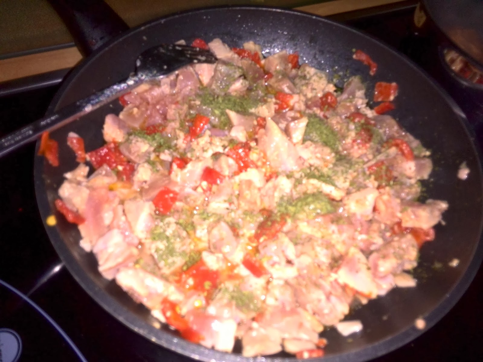 En una sarten ponemos a pochar un poco de cebolla, unos trocitos de pimiento verde, unas aceitunas picadas, un poco de perejil picado y el atún cortado en dados.Salpimentamos.