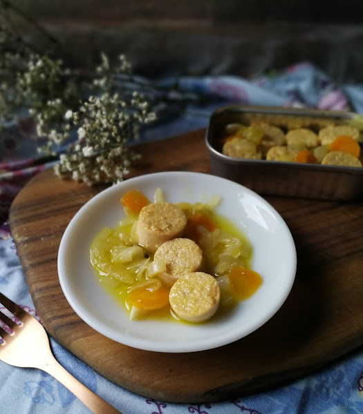 600 gr. de atún 200 ml. de caldo de pescado200 ml. de vino blanco1 cebolla 2 dientes de ajos2 hojas de laurel 1 cucharada de harinasal , pimienta molida , aceiteperejil