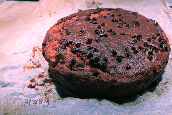Viértelo sobre el molde que quieras usar. En mi caso, usé una fuente de cristal para el horno, cubierta con papel de cera. Vertí la mezcla sobre el papel. Al ser redondo, quedó como una magdalena gigante. Por último, le añadí unas pepitas de chocolate, por encima.