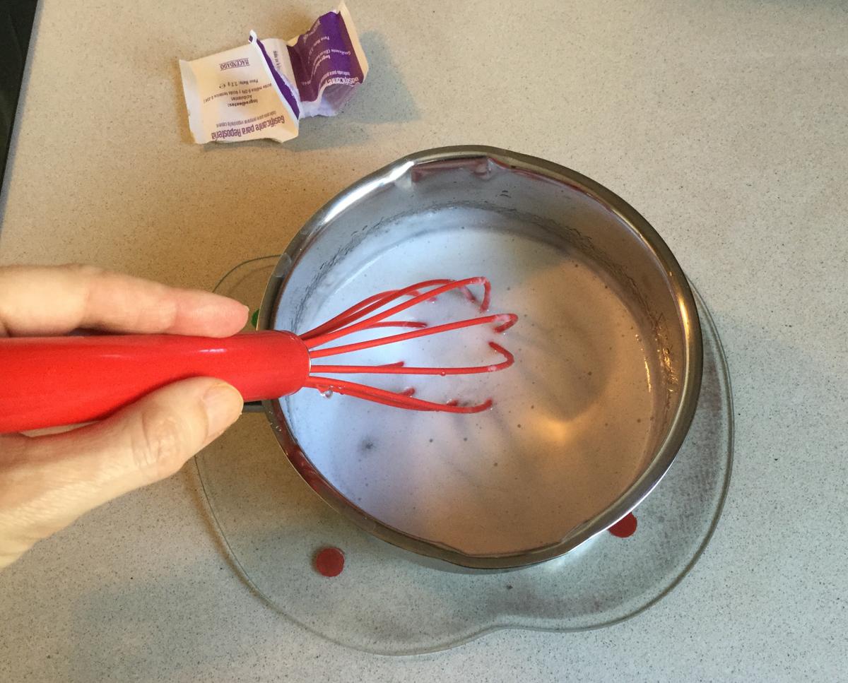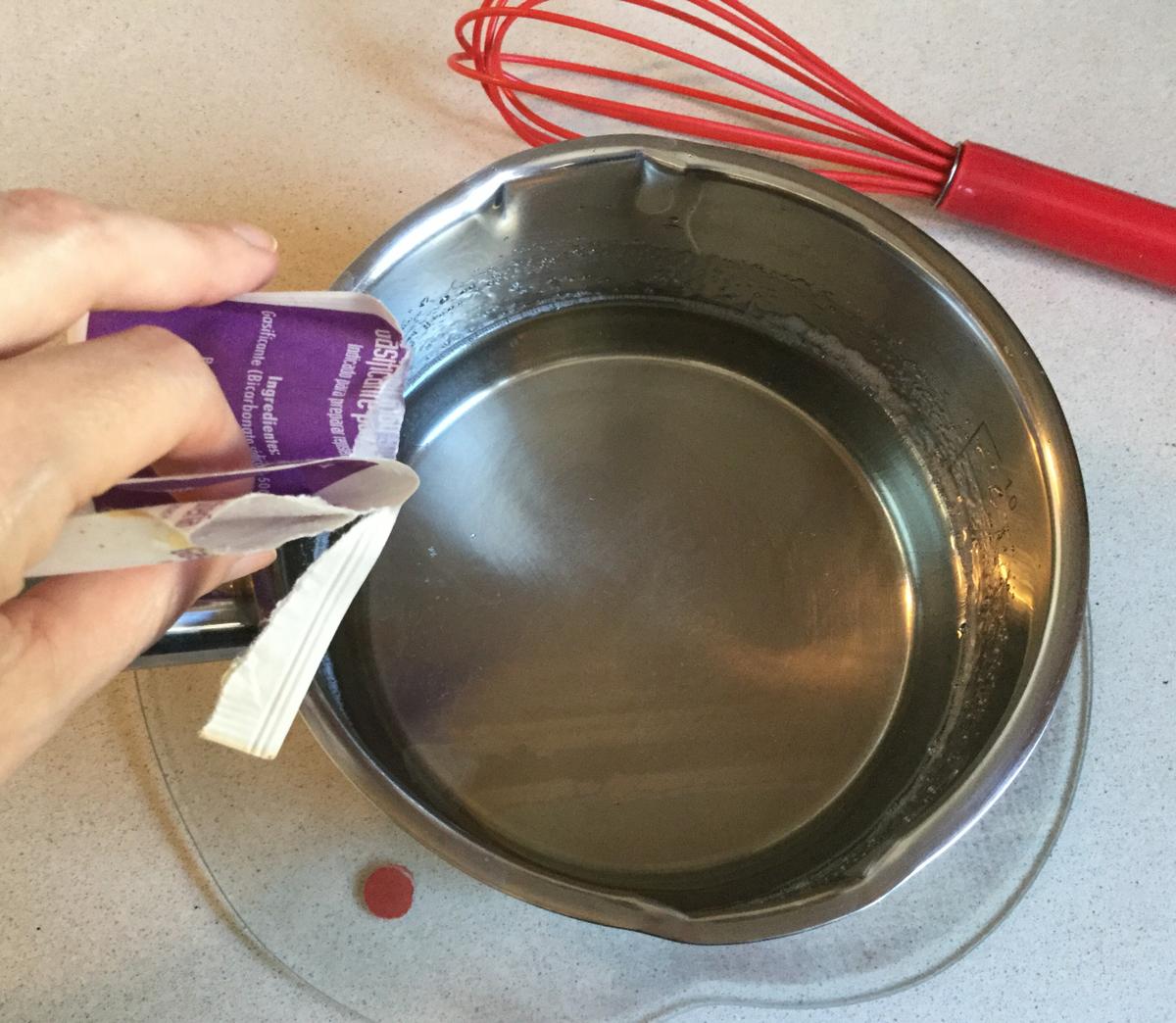 Retiramos del fuego y esperamos a que baje la temperatura hasta que esté caliente pero no nos quememos al tocar el cazo. Entonces, vertemos el bicarbonato