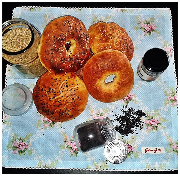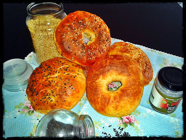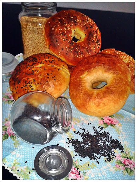 Calentamos el agua y la leche en el microondas sin llegar a hervir. Para la masa he usado una amasadora eléctrica. He mezclado todos los ingredientes en el bol y mezclo hasta que la masa se despegue de las paredes, aproximadamente unos 10 minutos. En una superficie enharinada, dividimos la masa en tantas partes como bagels queramos hacer. Formamos las bolas y dejamos reposar con un paño húmedo por encima unos 35-40 minutos. Pasado ese tiempo,ponemos el horno a precalentar a unos 230ºC. Hacemos los agujeros, si se los queremos hacer, yo he usado un utensilio de cocina que tenga el mango redondo y agrandamos el agujero con los dedos untados en aceite. Ahora puede pareceros muy grande pero en el horno se cerrará. Ahora es el momento de escaldarlos. Ponemos una olla con agua a hervir y, uno a uno, introducimos los bagels en el agua y ayudándonos de una espumadera los sumergimos bien. Retiramos del agua después de unos 30 segundos y los ponemos en una bandeja de horno. Observaremos que a cambiado la textura de nuestros bagels y que ahora tienen una película seca por fuera y son más fáciles de manejar. Es el momento de bañarlos con un poco de leche y colocar las semillas que queramos, sésamo normal o negro, semillas de amapola, cebolla frita... Horneamos unos 10-15 minutos o hasta que estén doraditos... y ahora... a disfrutarlos!!!!