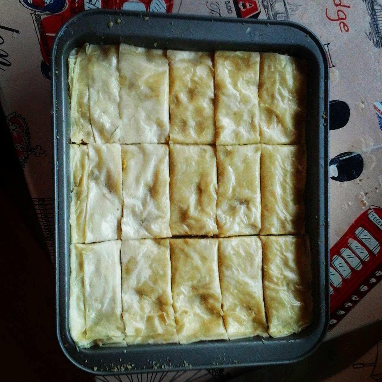 Cuando el baklava esté dorado lo sacamos del horno y vertemos el almíbar.