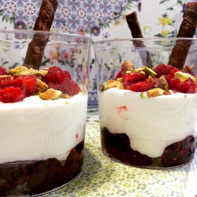100 gr de yogurt griego,80 gr de nata para montar,30 gr de leche entera,3 hojas de gelatina,30 gr de azúcar glass,medio jugo de kimón,200 gr de frambuesas frescas,300 gr de miel de azahar,1 hoja de mentaMontaje: Colocamos en una bandeja cuatro aros de inox, y los vamos rellenando con el mousse y las frambuesas encima, así sucesivamente, acabando con una capa de mousse, lodejamos en la nevera para que cuaje, durante 6 horas. Decoración: Desmoldamos la mousse y la colocamos en el centro del plato, decoramos con frambuesas, y por último la miel por encima.