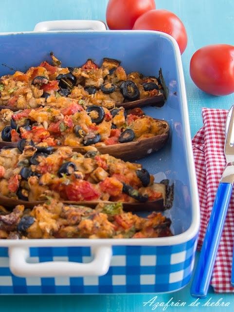 Así, podemos encontrar berenjenas a la napolitana como esta receta del blog Azafrán de hebra. En esta versión, la autora vacía la pulpa de la berenjena antes de hornearlas y la mezcla con el resto de ingredientes que conformarán el relleno: tomates, aceitunas negras sin hueso, miga de pan, alcaparras, anchoas, orégano y perejil, ajo, sal, pimienta y aceite de oliva.