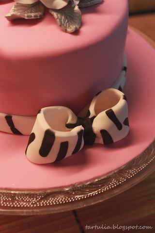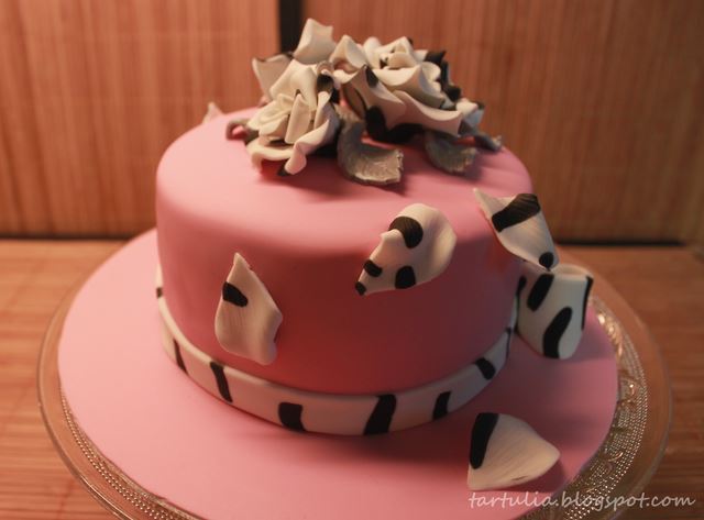 La tarta fue surgiendo poco a poco, busque un color sobre el que destacar las flores y me decidí por un rosa Claret de Sugarflair, teñí el fondant y cubrí la tarta que había rellenado y cubierto íntegramente con el ganache de chocolate blanco (receta aqui) Hice un lazo también en blanco y negro, igual que las rosas, que deje secar y rodee la tarta de una cinta de fondant también en esos colores.