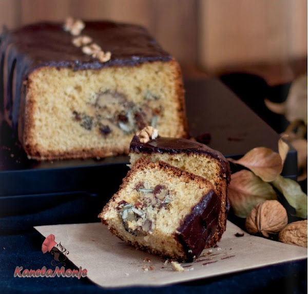 Decoramos con unas Nueces por la parte de arriba. Dejamos que el glaseado seque y ya tenemos listo nuestro bizcocho de frutos secos.