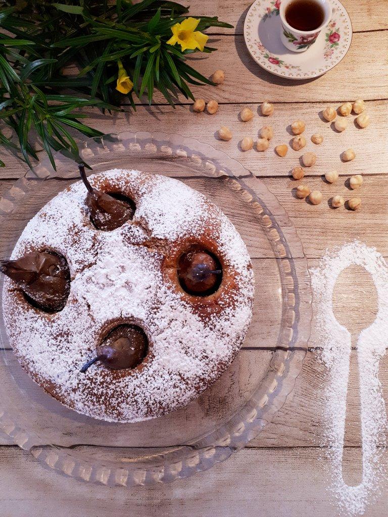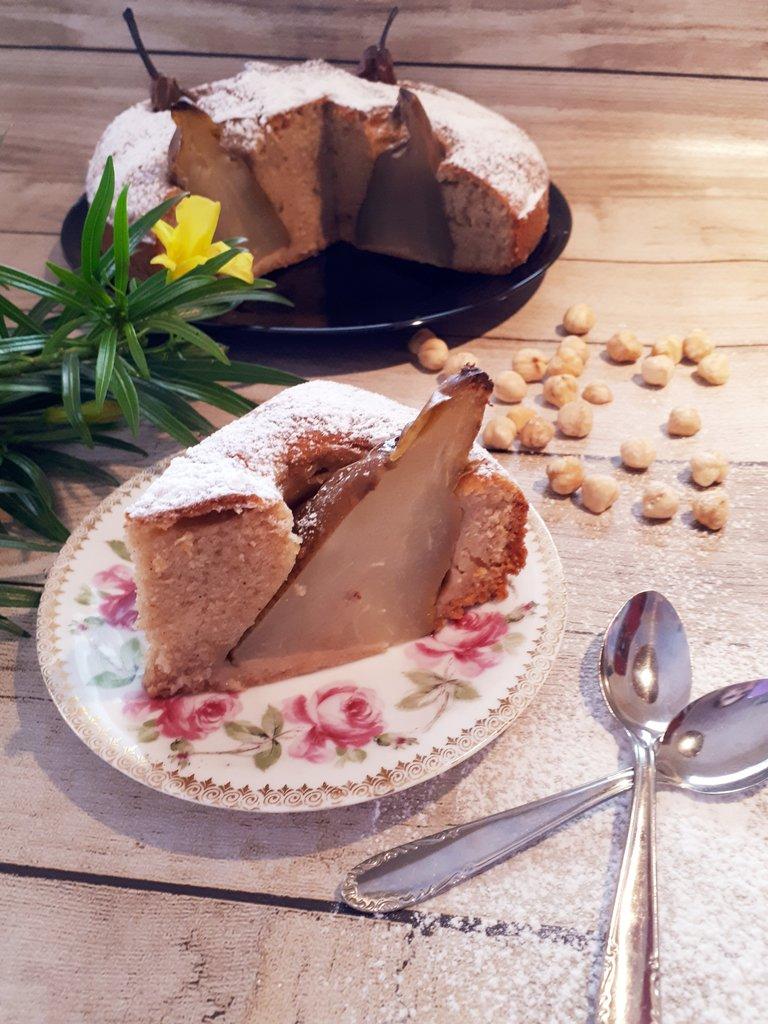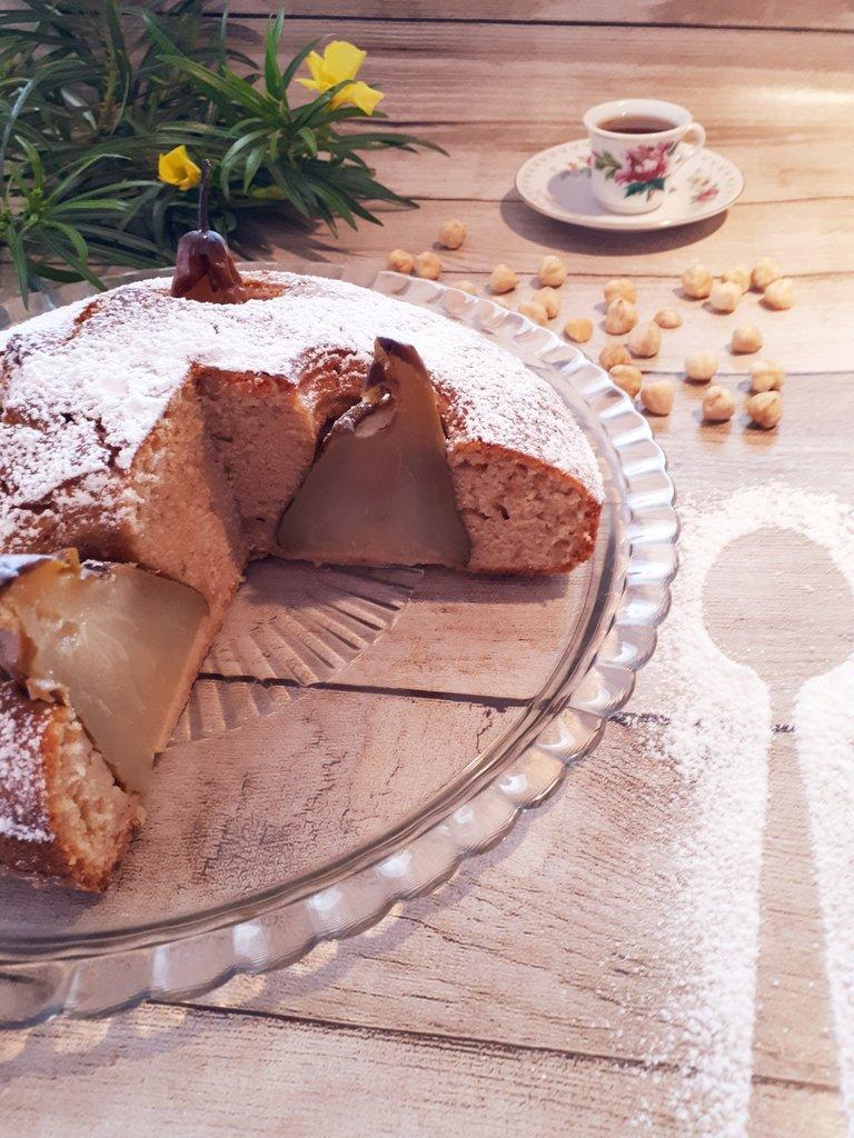 He de reconocer que desde que vi esta receta me enamoró por el corte tan elegante que tiene el bizcocho, pero la mayor sorpresa vino cuando lo probamos. Sin lugar a dudas es uno de los mejores bizcochos que he degustado. Los aromas entremezclados de coco, con canela y limón quedan en perfecta armonía con el delicado y sencillo sabor de las peras y avellanas.