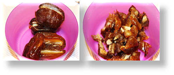 Retira el hueso de los 4 dátiles y corta en trocitos pequeños. Reserva.