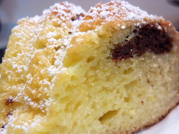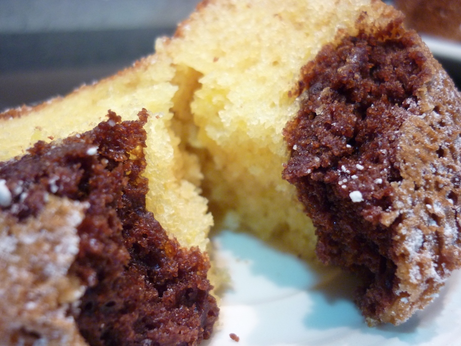 En un molde de silicona vertemos la mitad del preparado sin chocolate, luego la mezcla de chocolate lentamente sin llegar a los bordes y luego despacio también la otra mitad cubriendo el chocolate, quedando una veta en el interior del bizcocho.