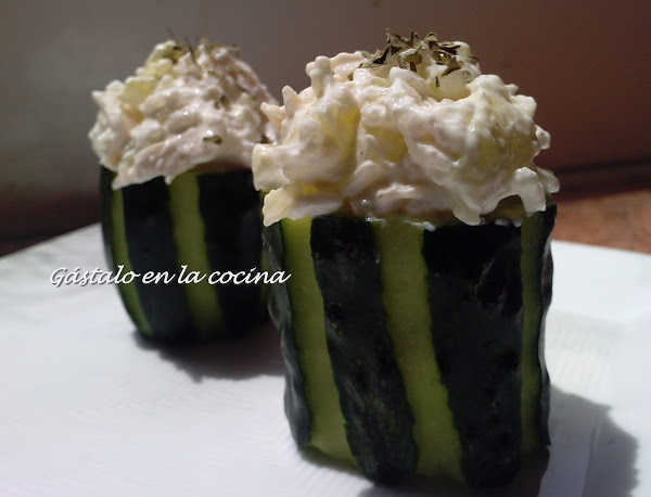 pepino,queso de cabra,queso blanco 0%,queso fresco cremoso 0%,huevas de Lumpo,eneldo,sal,chorro de aovePelamos el pepino con un pelador y conservamos las tiras de la piel las podemos escalfar 3 minutos, para que sean más manejables, escurrir y reservar.Cortamos los pepinos en trozos iguales y los vaciamos parcialmnte dejando un fondo de 1 cm.Mezclamos bien el resto de los ingredientes y rellenamos los pepinos que sobresalga un poco por encima.Atamos las tiras del pepino para decorar y lo metemos en la nevera hasta la hora de servir.