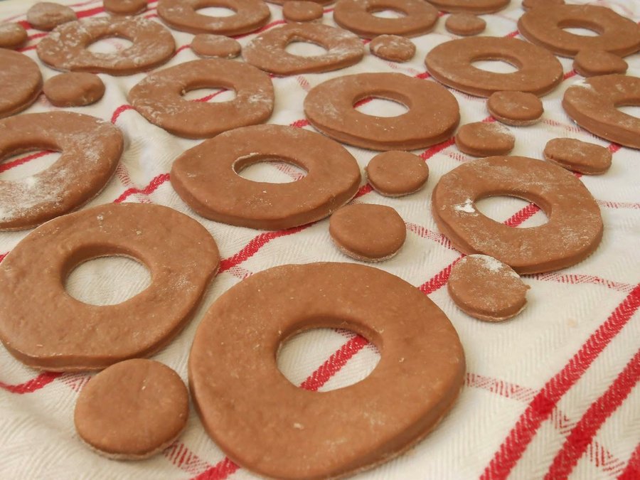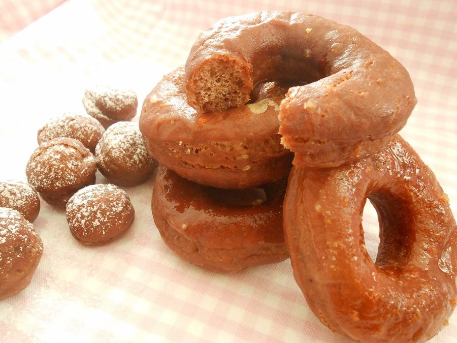 Estos donuts de chocolate se hacen con: levadura fresca, leche, harina común. azúcar, esencia de vainilla. cacao en polco Valor,3 yemas de huevo y aceite para freírlos. Para glasear: 1 mandarina y azúcar glas. Se mezclan los ingredientes y se deja reposar. Cuando haya doblado el volumen, se cortan tal como aparece en la imagen y se dejan levar otra vez. Se fríen en aceite de girasol hasta que estén dorados.