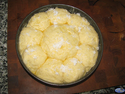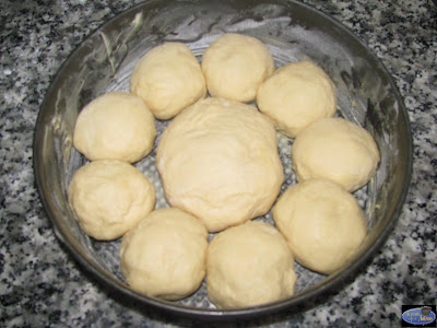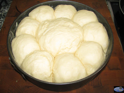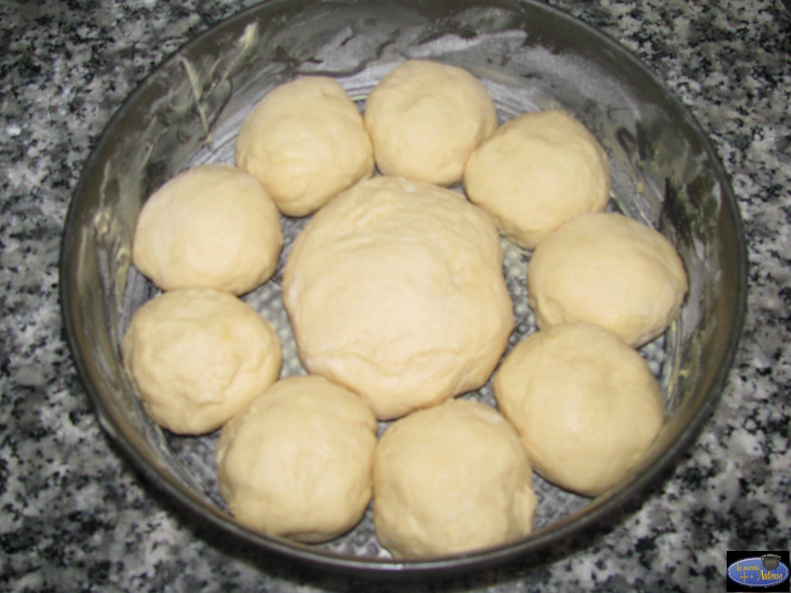 Estiramos la masa para sacar el gas que pueda tener y formamos unas bolas que disponemos alrededor del molde colocando una más grande en el centro.Dejamos una hora para que doble otra vez el volumen.