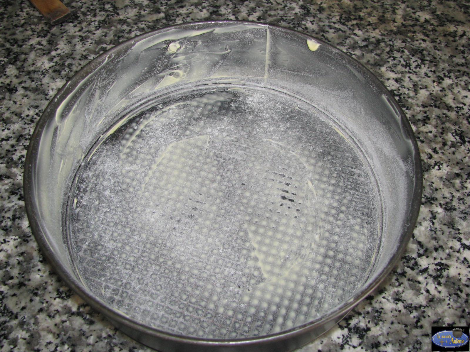 Engrasamos un molde redondo con mantequilla y un poco de harina.