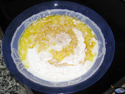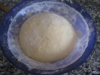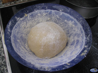 Amasamos hasta obtener una masa homogenea y que se pegue un poco a las manos.Tapamos y dejamos que doble su volumen una hora aproximadamente.