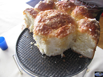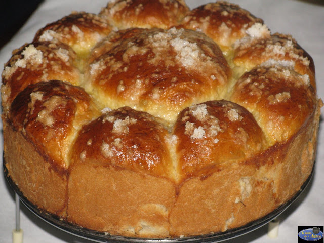 Creo que tardaré una temporada en hacer algo más de postres porque hoy definitivamente mi mujer me ha dicho que me va a precintar el horno por lo civil o por lo criminal.No se si lo dice por la factura de la luz o por el dietista que nos vamos atener que pagar todos en esta casa.Y no penséis que exagero,este es el aspecto que tenía el bollo a las dos horas de sacarlo del horno y todavía quedaba la merienda.