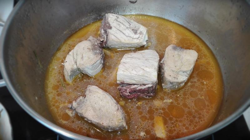 Retiramos de la olla todo menos el líquido y subimos la temperatura para introducir los trozos de bonito. Los tendremos a fuego medio 1 minuto por cada lado. Dejamos reposar unos 20 minutos con el fuego apagado y aprovechando el calor residual.