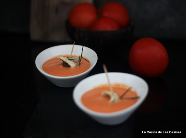 10 g de almendras crudas 10 g de avellanas peladas 10 g de pan frito 3 dientes de ajo con piel 1 pimiento choricero 2 tomates en rama 1 cucharada de vinagre 4 cucharadas de aceite de oliva una pizca de pimienta blanca 1 tallo de blanco de puerro en juliana 1/2 kg de boquerones harina sal 3 rebanadas de pan de molde tostadas.Para elaborar la salsa romescu ponemos en una placa de horno el tomate, los ajos, los frutos secos y el pimiento choricero junto con un chorro de aceite de oliva. Introducimos en el horno precalentado a 180º durante 30 minutos aproximadamente, sacamos y trituramos junto con el vinagre hasta que quede una crema espesa. Salpimentamos y reservamos.