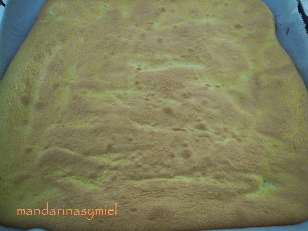 - Separa las claras de las yemas.Monta las claras a punto de nieve.Añade el azúcar y sigue batiendo hasta que se forme un merengue liso. Cuando estén montadas pon las yemas y mezcla.Tamiza la harina y añade al merengue, con cuidado, para que no se baje.Extiende toda la mezcla sobre un papel de horno y honéalo a 180º unos 10 minutos