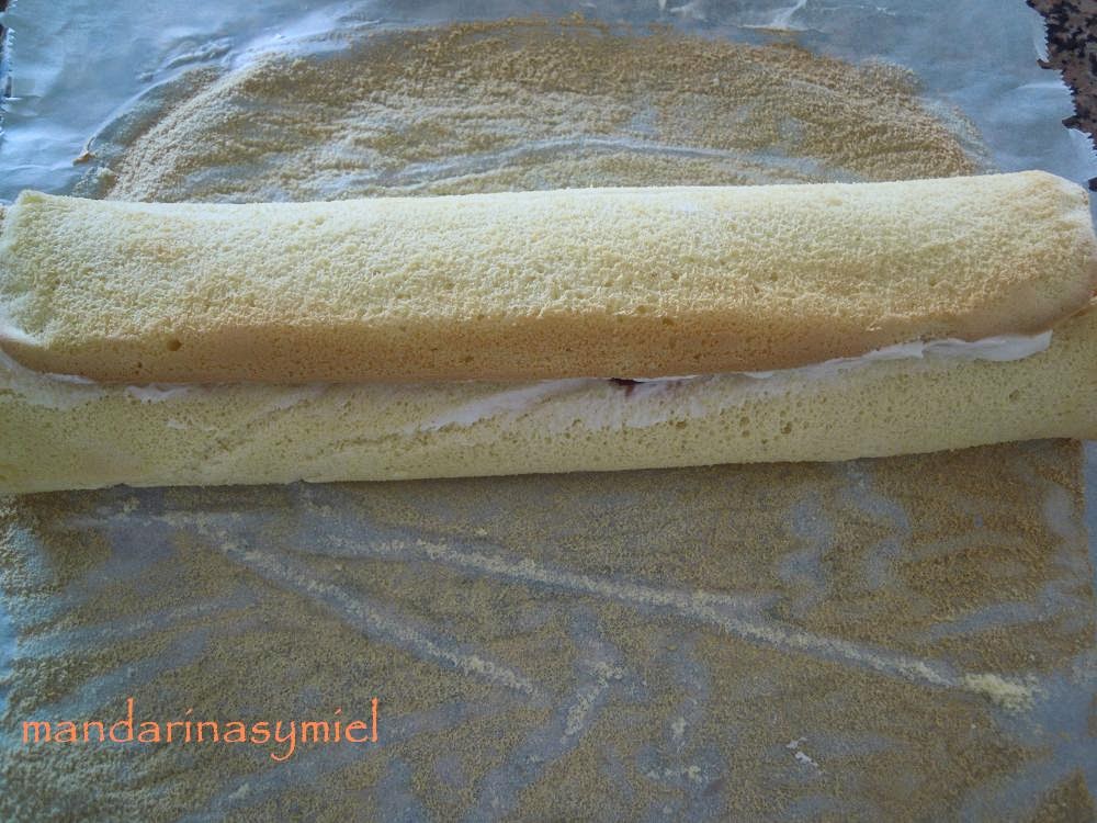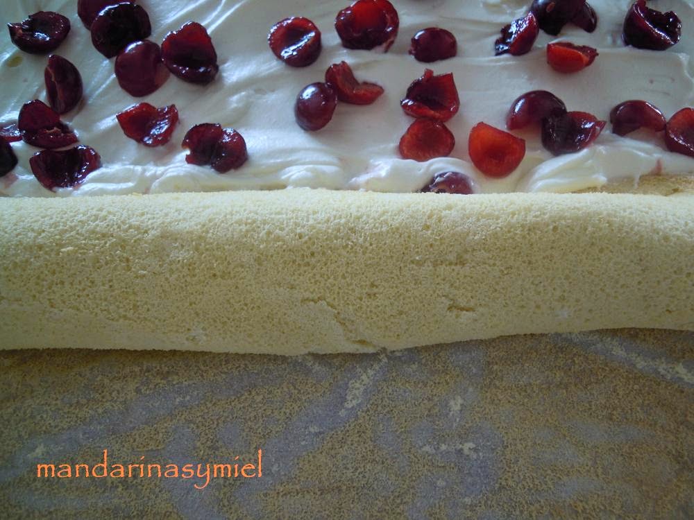 - Monta la nata, (que debe estar muy fría), añade el azúcar y sigue batiendo.Limpia las cerezas y quítales el hueso, parte por la mitad.Pon la nata montada por todo el bizcocho, extiende y echa por encima los trozos de cereza.Enrolla con cuidado de que no se salga la nata. Cuando esté enrollado, tápalo con papel film y guarda en la nevera unas 3 horas.