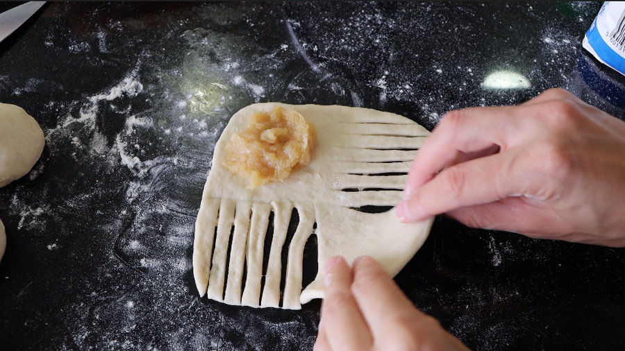 3. Amasar ligeramente la masa y dividir en 5 partes. Enrolle cada uno en un cuadrado. Forme las hamburguesas como se muestra en el video y déjelas reposar durante 1 hora. Luego engrasar con leche y hornear a 180 grados durante 20-25 minutos.