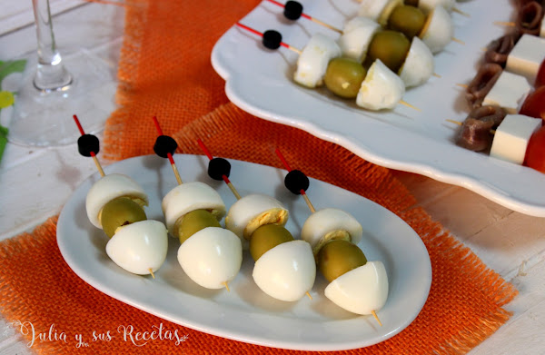 Ponemos en cada brocheta un huevo de codorniz cocido (7 minutos en agua hierviendo), envuelto con una tira de jamón ibérico.
