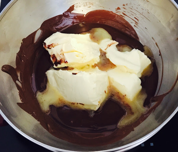 A baño Maria, ponemos una cacerola con agua y un bowl arriba, que el agua a penas toque el recipiente de arriba. Muy importante que el agua no hierva, por que se quema el chocolate y queda con un sabor muy fuerte y amargo. Una vez que el chocolate esta casi todo derretido le agregamos la manteca para que se derrita tambien, y lo sacamos del fuego y lo dejamos templar un ratito mientras hacemos la masa.