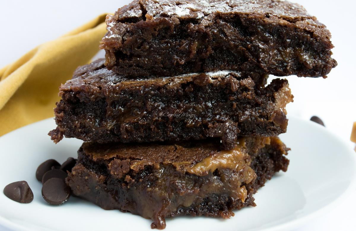 Estos brownies acaramelados vienen doblemente cargados de chocolate gracias a una capa de chocochips que va en el medio de la mezcla, y como si eso no fuera suficiente un rico baño de caramelo los convierte en un delicioso y decadente manjar.