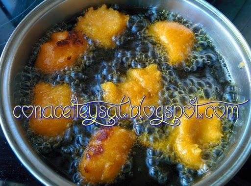 Pasados esos 45 minutos, destapamos nuestra masa y en una olla añadimos aceite a media temperatura ( la mitad del fuego) y cuando este caliente con la ayuda de una cuchara empapada en aceite frio cogemos la medida de la masa y dejamos que se desplace hacia el aceite.