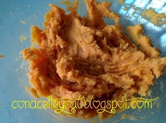 Una vez pasado el tiempo, reservamos el agua de la cocción del boniato, pelamos el boniato o batata y comenzamos a machacarlo para empezar a formar una masa.