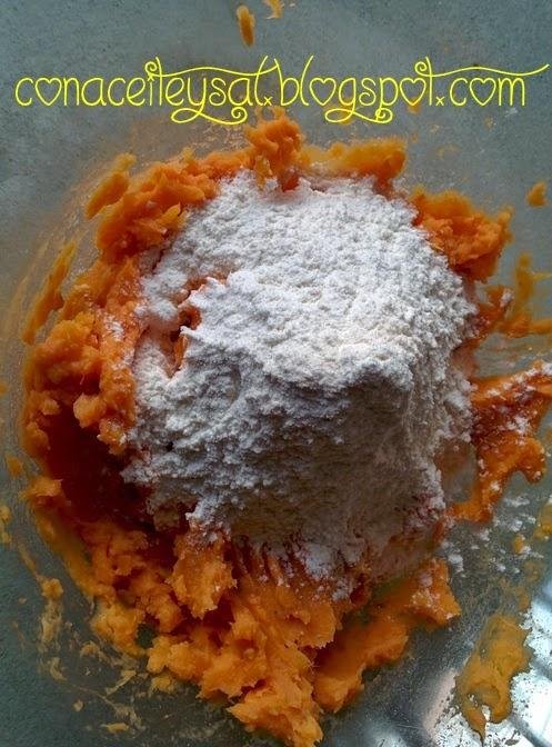 Poco a poco a la masa del boniato/batata le agregamos la harina y removemos