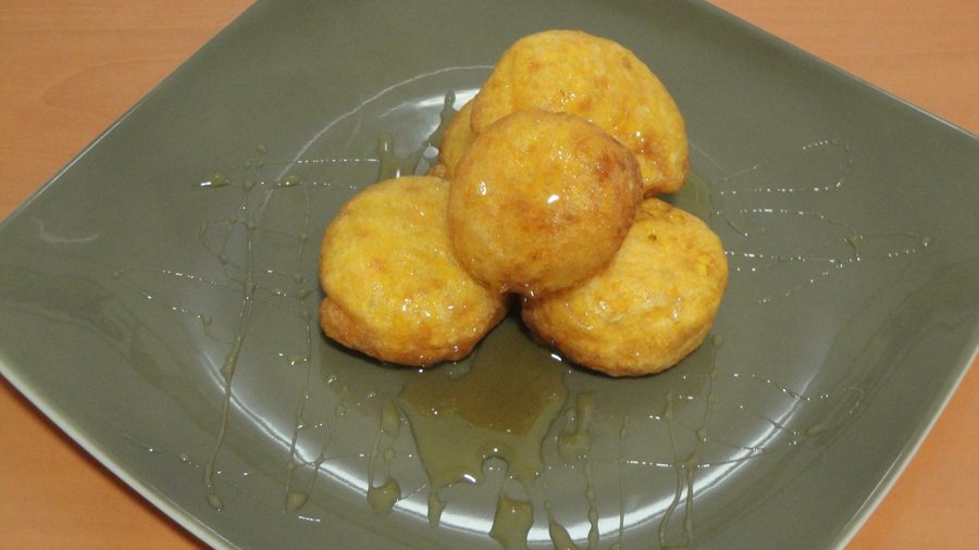 Colocamos nuestros buñuelos en un plato y les echamos un chorrito de miel.