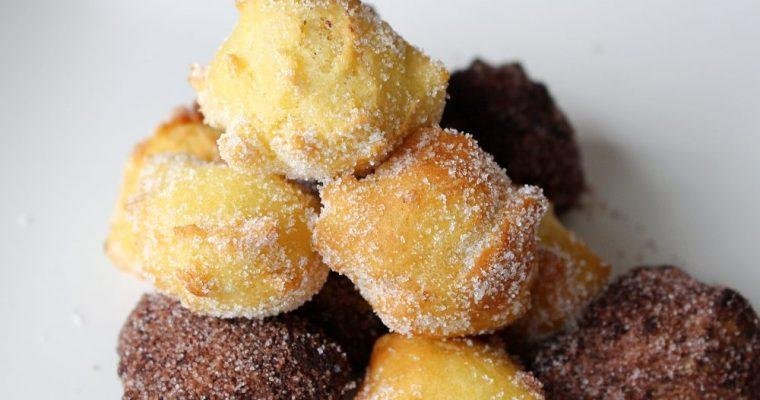 Ahora sí, llega el momento de freír los buñuelos. Para ello, haremos bolitas con ayuda de unas cucharas o bien con la mano engrasada y las freiremos con el aceite fuerte. Desde que las echemos al aceite por primera vez, será recomendable darles vuelta con ayuda de una espumadera para que todas las partes se doren. Una vez listas, sacamos a un papel absorbente, quitando la grasa sobrante. Por último, solo queda añadir la cobertura de azúcar, que puede complementarse con canela o con cacao, como en mi caso. ¿Se te ocurren más alternativas?