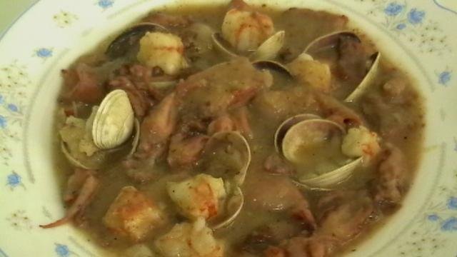 Una vez los calamares estén tiernos añadimos los gambones y las almejas, tapamos unos minutos hasta que la almeja se abra, y listo, receta terminada.