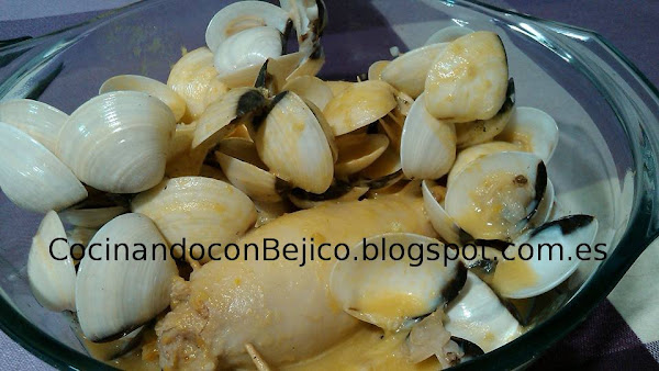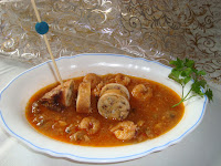 CALAMARES RELLENOS EN SALSA \\\\\\\\\\\______ INGREDIENTES \\\\\\\\\\\\\\\\\\\\\\ 1/2 kl. Calamares 1 huevo duro 2 dientes de ajos las patitas de los calamares un poco de perejil caldo de pescado, el mio casero pizca de pimienta negra molida una loncha de jamón serrano picado 1 huevo batido y puré de patatas una ñora 1 vasito de vino moscatel un puerro mediano unas cuantas de almendras crudas un rebanada de pan fríto aceite , sal 1 cebolla pequeña 1/4 gambas 1/4 almejas PREPARACIÓN \\\\\\\\\\\\\\\\\\\\\\\ Esta receta esta echa a mi manera ponemos las patas de los calamares a cocer un ratito con una poca de sal, picamos el huevo duro , la loncha de jamón , un diente de ajo , el perejil , las patas que estarán cocidas ,unas cuantas de gambas , unas cuantas de almejas , le ponemos una pizca de pimienta molida, el huevo batido y el puré el que veamos necesario, con esta mezcla rellenamos los calamares que tendremos limpios, que no estén muy llenos y con un palillo los sellamos. Los pasamos por harina y los freímos un poco. Hacemos la salsa ponemos en remojo la ñora,en una cazuela ponemos aceite y vamos sofriendo el puerro , la cebolla la ñora cuando veamos que el sofrito esta echo , le ponemos el vino y cuando evapore el alcohol apartamos , y lo ponemos en la batidora junto con las almendras fritas y la rebanada de pan también frita, batimos todo y lo volvemos a poner en la cazuela , echamos los calamares fritos , ponemos caldo de pescado , las almejas y las gambas peladas ambas , probamos de sal, y cocemos al fuego lento hasta ver que esta echo, recomiendo esta salsa queda muy buena