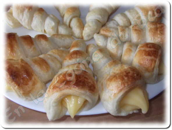 Enrollamos las láminas de hojaldre en moldes pequeños con forma cónica (con la parte pintada hacia fuera) :