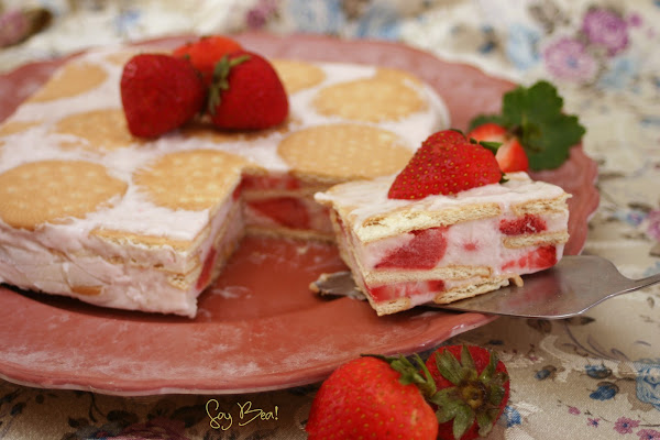 Forrar un molde con papel film, poner una capa de galletas en la base, luego una capa de la crema y por encima fresas rebanadas