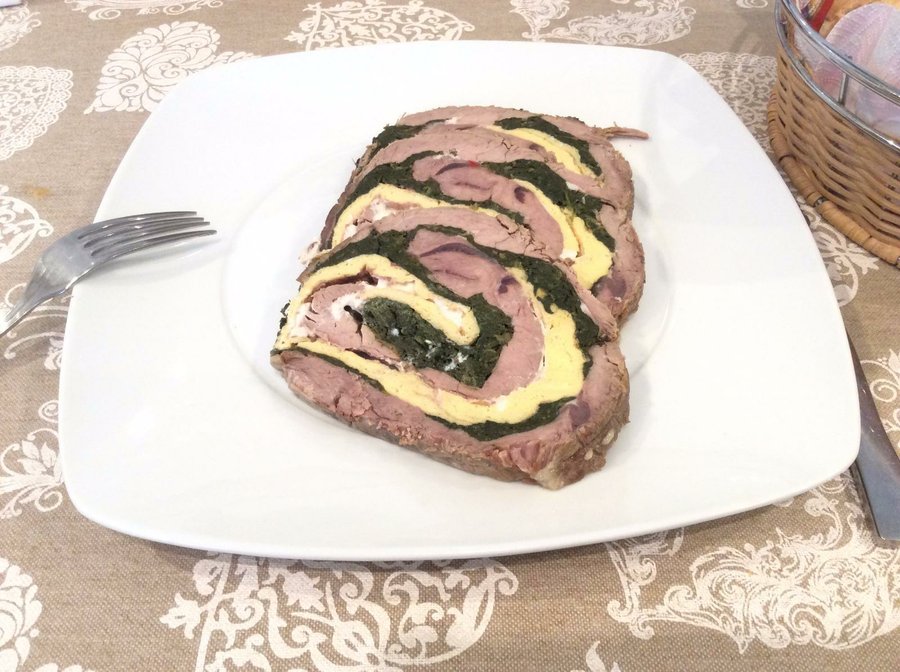Procederemos a enrollar cuidadosamente la carne de ternera con los ingredientes y cuando este totalmente cerrada la ataremos con un hilo resistente de cocina.
