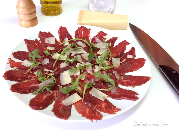 A continuación, retiramos el paquete del congelador, desenvolvemos y cortamos en lonchas muy finas con un cuchillo bien afilado o con una máquina de cortar fiambre. Repartimos la carne en 4 platos, la colocamos bien extendida, la tapamos con un plástico transparente y la dejamos reposar en el frigorífico hasta el momento de servir.