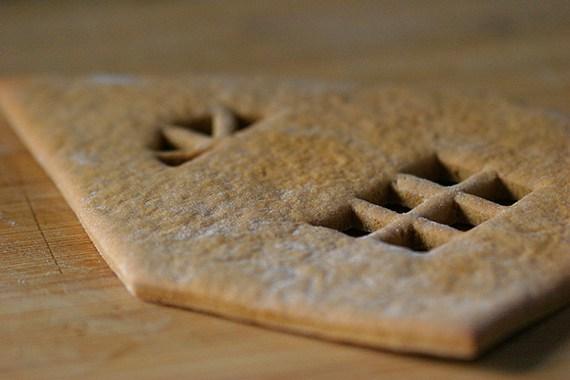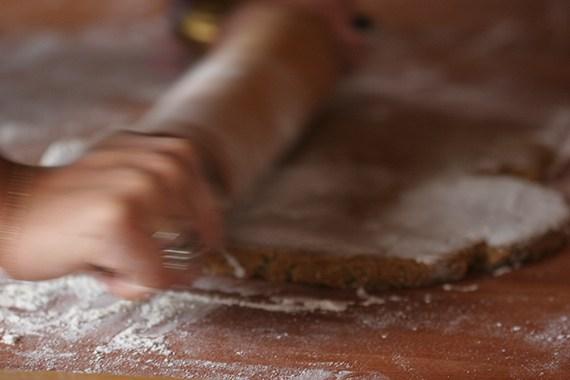 Cuando esté listo para hornear pan de jengibre, precaliente el horno a 350 grados y despliegue cada disco de masa sobre una superficie ligeramente enharinada. La masa será algo dura, así que tendrás que ponerle algo de coda para hacerlo delgada. Siga rodando en un movimiento hacia adelante y hacia atrás, girando el disco de masa y poniendo el pin y la superficie en medio. Ruede hasta que la masa tenga aproximadamente 1/8 de pulgada de grosor. Si la masa se calienta al manipularla, colóquela en el refrigerador antes de cortar las plantillas para enfriar la masa.
