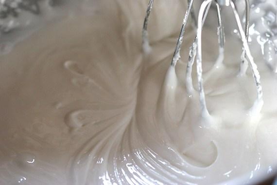 Batir las claras de huevo en un bol hasta que estén espumosas. Agregue el azúcar y continúe batiendo hasta que esté blanco y brillante.