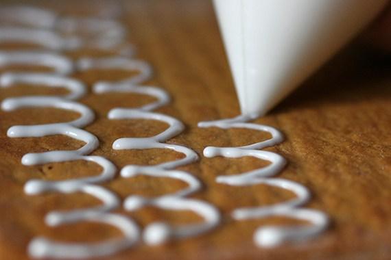 Comience a decorar creando U a escala de pez en los dos techos. Traza los bordes de las ventanas y puertas con glaseado y añade los detalles adicionales que desees. Hemos agregado puntos además de las líneas, pero esta es la parte divertida de casas de jengibre, ¡así que usa tu imaginación!